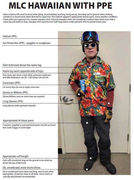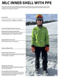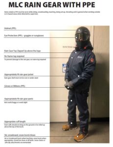 Below are a few samples of various MLC uniform combinations worn as expected. All uniform combinations, other than rain gear, require a nametag. Personal Protective Equipment (PPE) are required for all uniform combinations including gloves, eye protection, helmet and appropriate footwear.